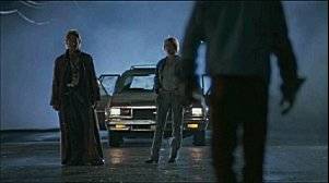 C'est en 1987 que sort Aux frontières de l'aube aux Etats-Unis (Near Dark en VO) réalisé par Kathryn Bigelow dont c'est le deuxième film (après The Loveless). Celle-ci rencontrera plus tard le chemin de James Cameron (Terminator, Aliens) qu’elle épousera et de leur rencontre naîtront Point break et le thriller futuriste (et déjà passé – comprenne qui pourra…) Strange Days. La jeune réalisatrice s’atèle donc en 1987 à l’écriture du script avec Eric Red qui avait déjà signé le scénario de Hitcher. Tourné en 49 jours dont 36 pour les prises de vue nocturne, Near Dark dégage une amabiance absolument délicieuse. En effet, tout dans ce film de vampires tend vers la perfection : la photographie met en valeur avec perfection le côté « sexy » de la nuit, la musique des Tangerine Dream est à pleurer (d’ailleurs, je vous recommande grandement Sorcerer de William Friedkin et Legend de Ridley Scott) et la performance des acteurs est saisisante (On retrouve une partie du casting de Aliens à savoir Lance Henrickson, Bill Paxton et Jeanette Goldstein).