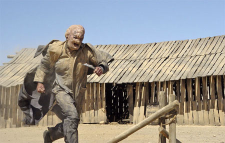 Le film commence très mal à cause d'un rythme lénifiant d'entrée de jeu. Le montage est apocalyptique, on ne comprend rien à ce qu'il se passe et tout cela est très peu bavard. On commence avec un cavalier qui traîne un cadavre pour le décapiter, puis on passe directement à un autre cow-boy qui attend près d'une voie ferrée où un Chinois pompe pour faire avancer une vieille planche avec trois types tout de rouge vêtus, aux yeux jaunes et à la bouche cousue. Le cavalier, alors caché derrière un arbre rabougri les attaque et essaye de soutirer des informations qu'il n'aura pas. On a alors une première scène gore, en image de synthèse avec une décapitation très mal foutue. Une voix off nous explique alors qu'il y a une zone dans le désert où les morts reviennent à la vie et que le cavalier doit tuer une seconde ceux qui ont violé son amoureuse et qu'il a déjà tué une fois dans une prison. En gros, il s'agit d'un film de vengeance avec des démons dedans. Seulement, tout est bancal.