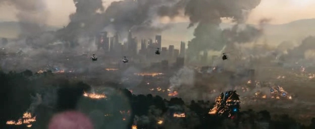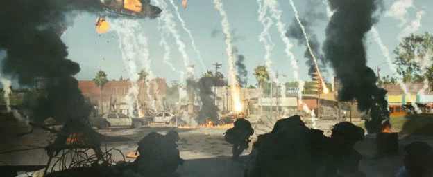 World invasion - Battle Los Angeles débute. Plus qu'un avertissement, c'est un constat dépeint avec amertume. Une ville en proie au chaos où s'affrontent les flammes, les explosions et autres dangers de la vie quotidienne. Le bruit du rotor assourdissant, les cris, les déflagrations, pas de doutes, nous sommes en guerre. La mise en scène s'attache particulièrement à retracer cette invasion de la manière la plus réaliste qui soit. Depuis