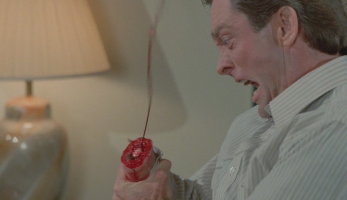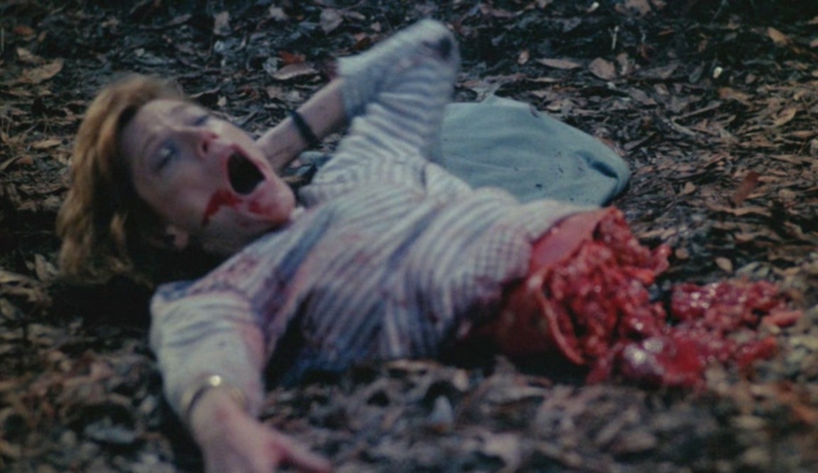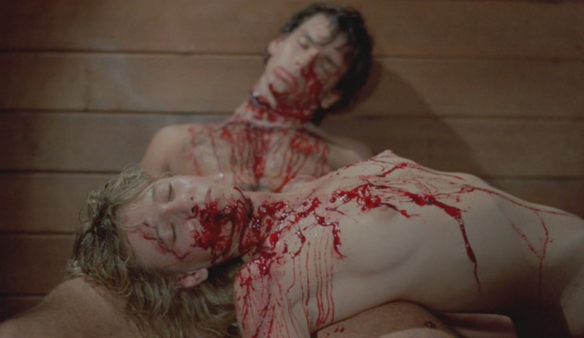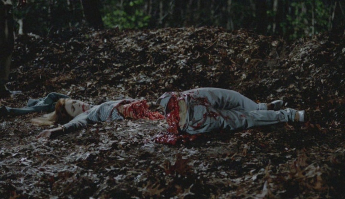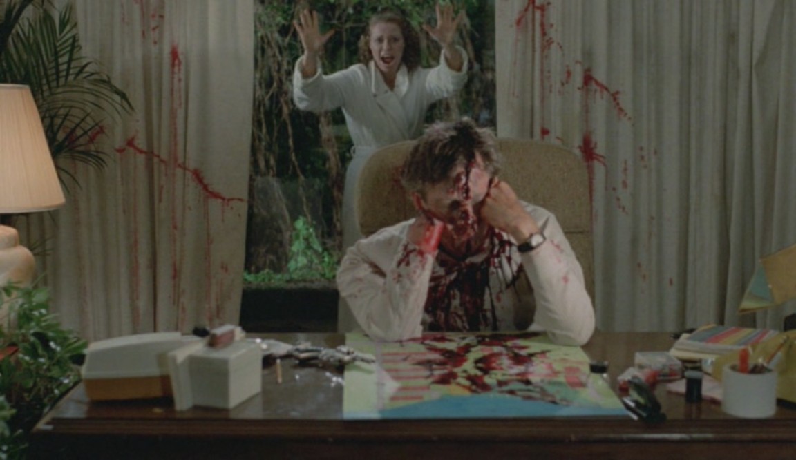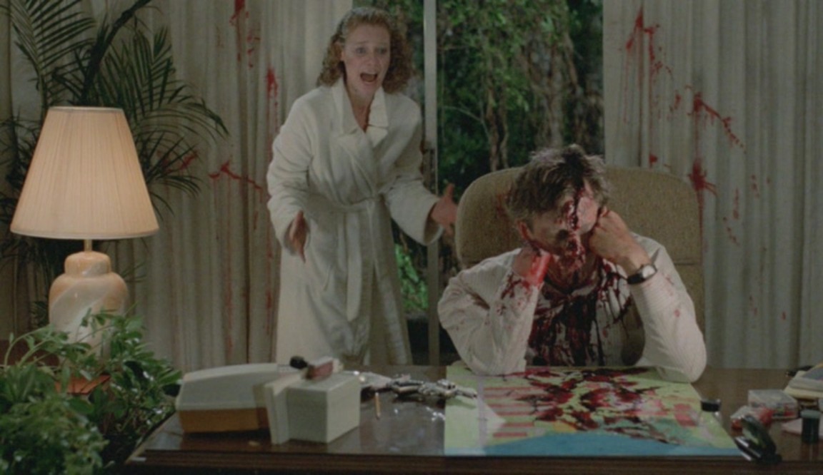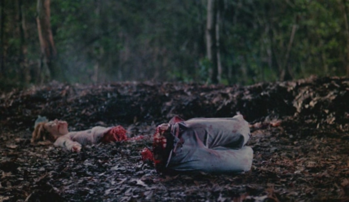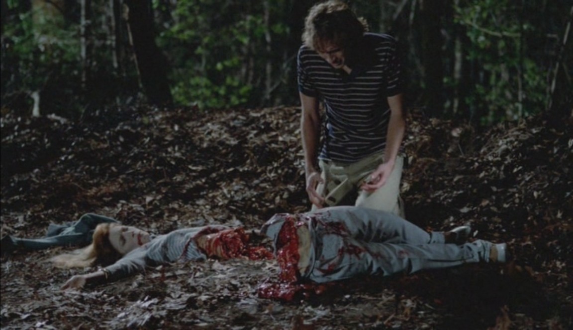 Puis il se met à observer un couple en train de s'affairer dans une voiture non loin. Mais quand l'amant lui dit d'aller jouer plus loin au plus vite, le jeune voyeur lui envoie un coup de lame en plein front, et barbouille de sang le visage de son frère, qui reste là, sous le choc... puis lui met la hache dans les mains !