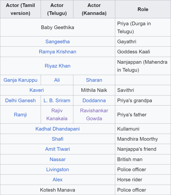Baby Keerthika (ou Baby Geethika selon les sources) joue le rôle de Priya.