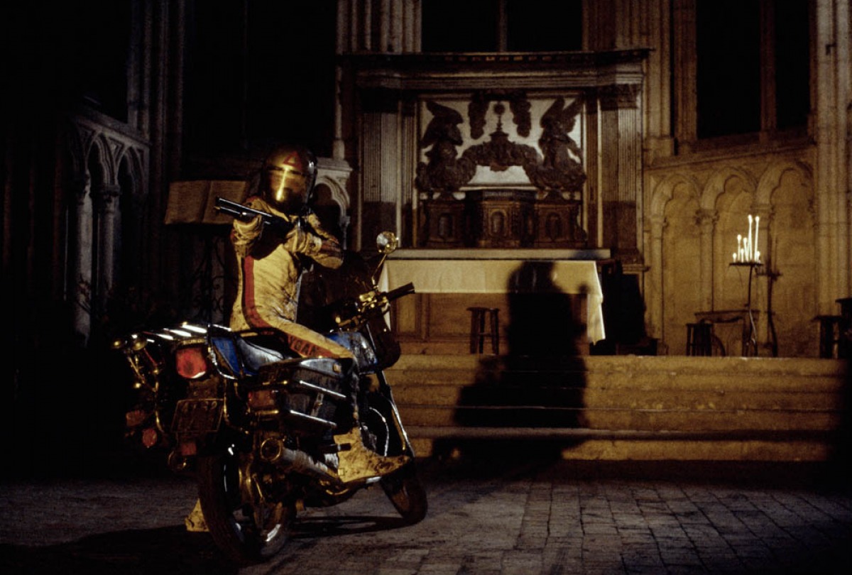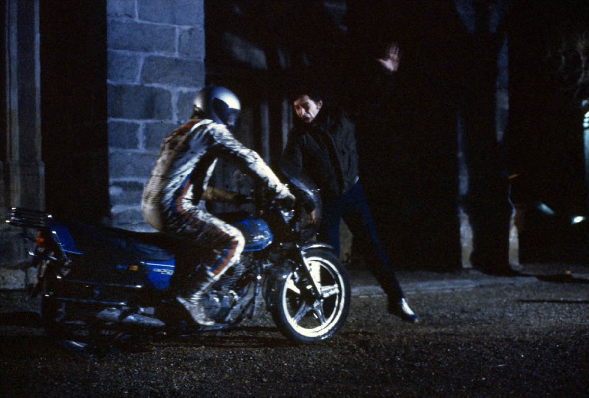 Un motard à la combinaison blanche tombe en panne dans un petit village.