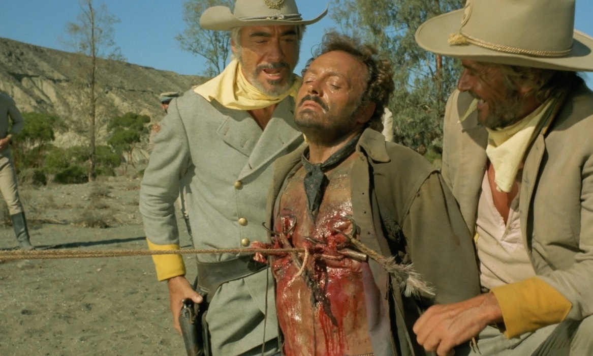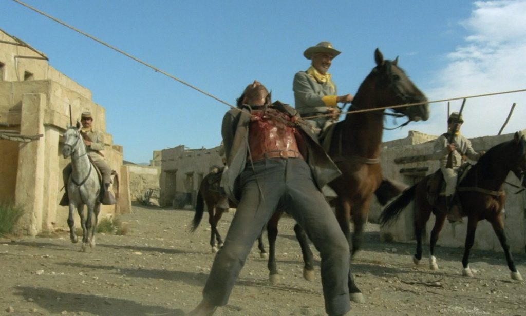 La plus connue du film demeure celle où Matt Brown (Vassili Karis, aperçu dans quelques péplums et westerns transalpins) est traîné par deux chevaux, à l’aide de deux crochets qui lui ont été enfoncés dans la poitrine.