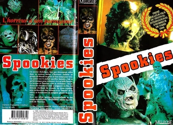 J'ai loué ce film dans ma jeunesse, à l'époque où j'étais un fan assoiffé de films d'horreur et que j'en regardais au quotidien. Bon nombre était ringards, comme ce «Spookies». Film d'horreur 80 bidon, histoire de jeunes imbéciles qui passent une nuit dans un manoir hanté par des semblants de monstres en latex. Dans la ligné de «La Nuit des Démons» et autres faux jetons.Lire la suite